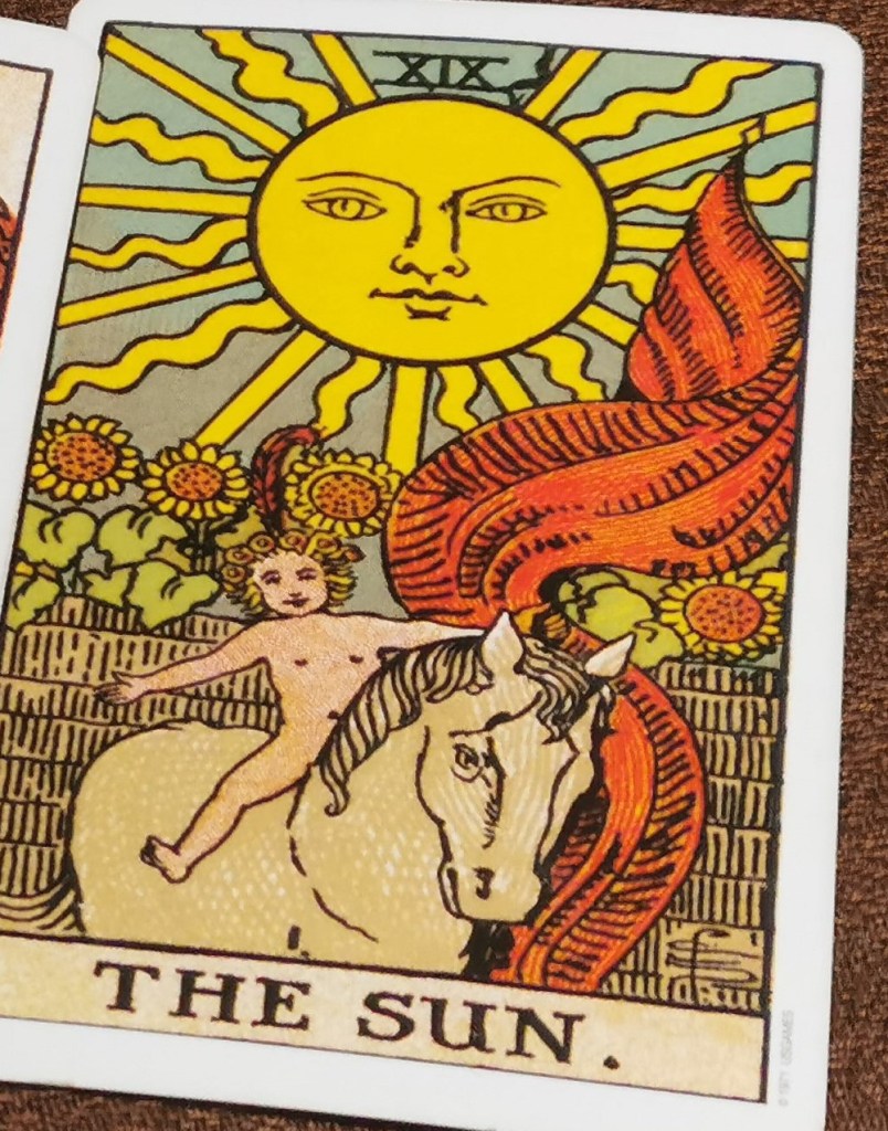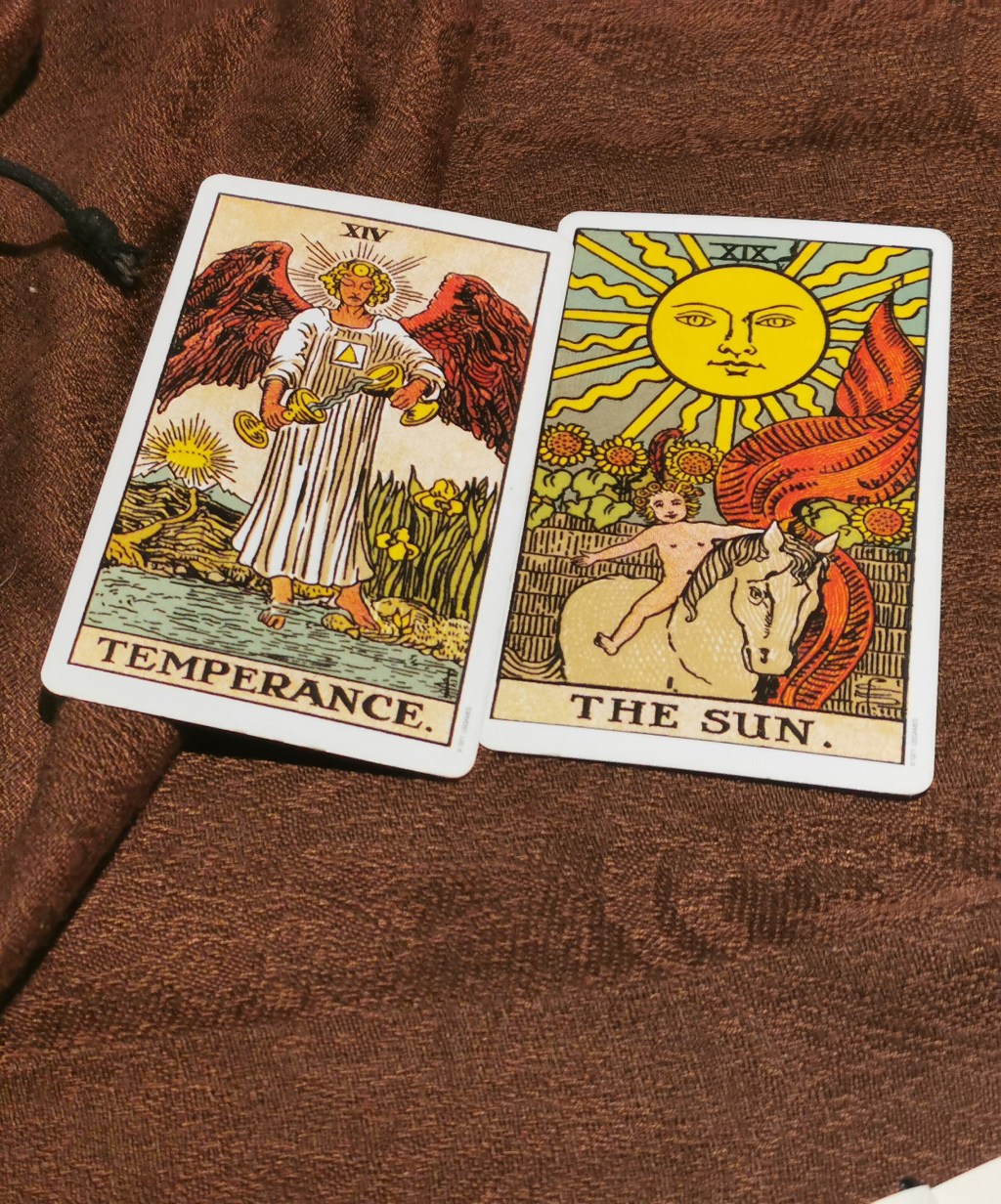Thanks to the regularity of kitchen table spreads, accompanied by hot coffee and angel cake, the warmth of my memories of this place and time are imbued with the visual symbologies of tarot. It is therefore unsurprising that, when I turned towards writing around The Sun and Temperance, the first two cards I drew as part of this creative project, my writing directed itself towards memories of “home”.