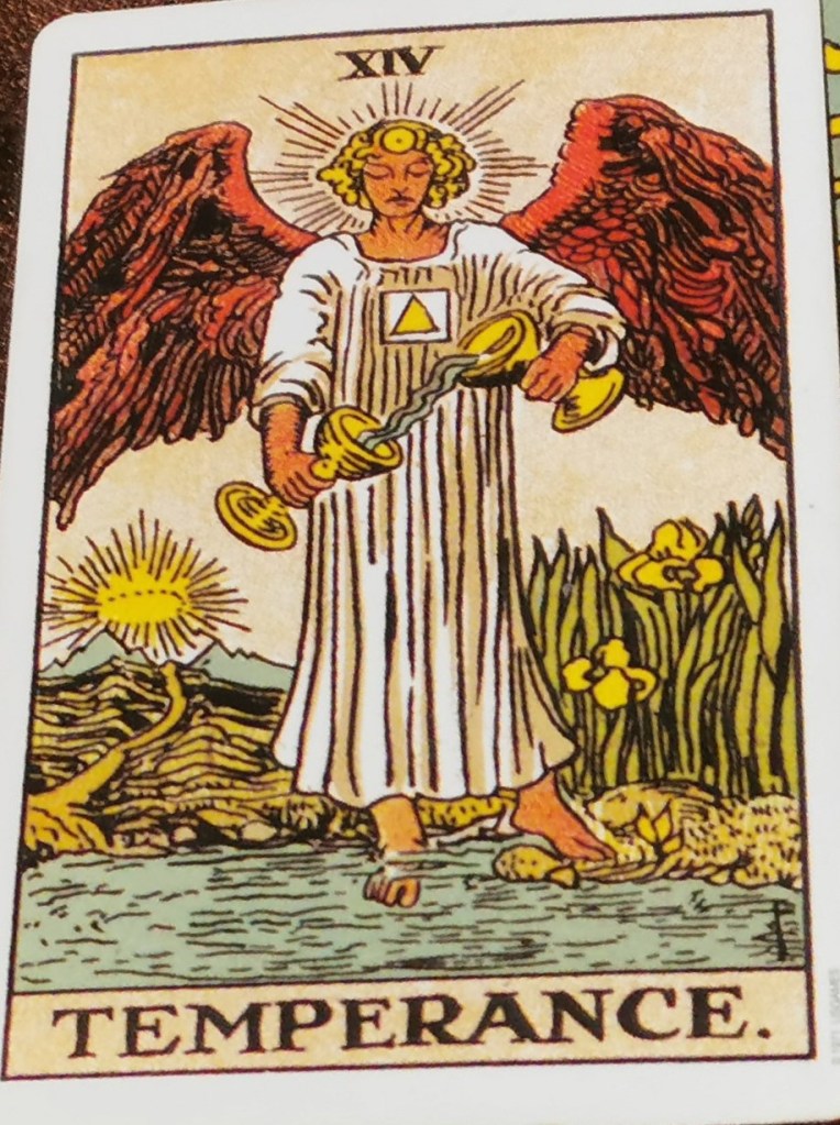 Temperance equally finds some reckoning with the past in order to frame an ecological life in the present. The figure in the Rider-Waite-Smith depiction of Temperance reminds me instantly of my mother standing over the washing up bowl at our new home after we left the cottage. I remember my mum being particularly house-proud during this time; she was dedicated to creating a beautiful home in our new surroundings, and for her that meant cleanliness. As a disabled single parent suffering with chronic pain, completing chores often meant pushing past discomfort. There is deep concentration on the face of the figure on the card Temperance, and it is the same expression I often saw on my mum, as she made her way through the cups and bowls of water. I wanted to find a way of balancing my intuitive and memory-based reaction to this card with the widely-accepted meaning. Simply read, the card is one of balance and harmony, however, as a much appreciated tarot reader informed me while I was in the shop, Temperance is also associated with alchemy.
